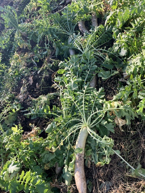 今日は給食室だより用の写真です。大根の収穫風景です。たっぷり抜いて、軽トラに積みます。大根はローム付近まで根を伸ばすためかなかなか抜けないので、腕が痛くなる……😵