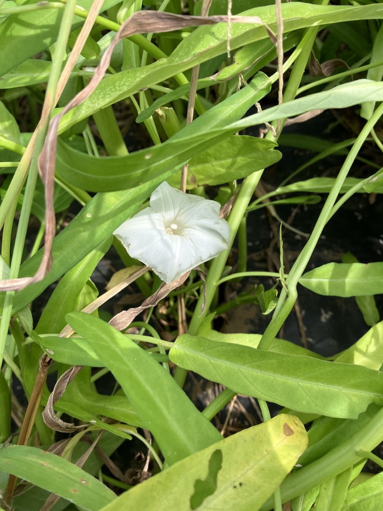 コレは空心菜の花です。普通に栽培してると出てきませんが、空心菜と同じ仲間のサツマイモも似たような花をつけるそうです。サツマイモや空心菜が属してるヒルガオ科は強い野菜が多いので、育てやすくて助かりますね😌