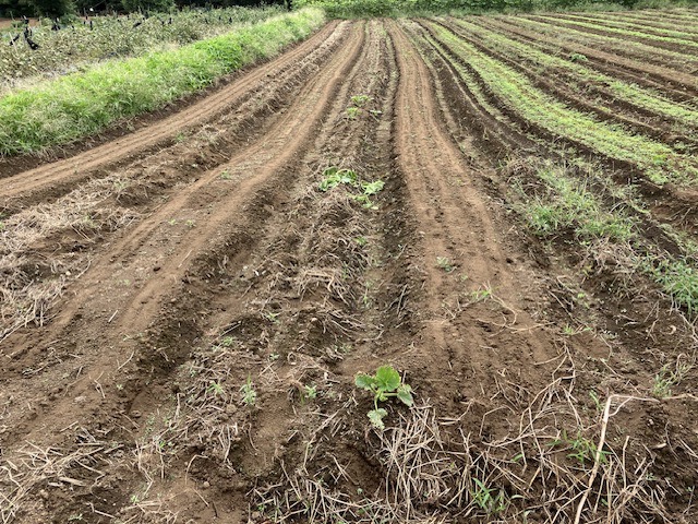 さて、この畑はもともとジャガイモを植えた畑でしたが、キタアカリがほとんど出芽せず、ほうれん草と春菊を植えました。