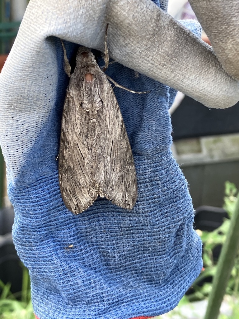 手袋を洗って干してたらずいぶん大きい(4〜6センチ)の蛾が止まってました。午前中だったので寝ていますね。