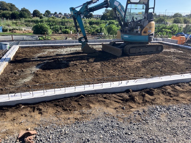倉庫・休憩所・選果場の工事が大詰めを迎えております。基礎部分はだいたい完成、埋め戻しを行っていました。今週中にも建物の骨組みとなる鉄骨が入ると思われます。
