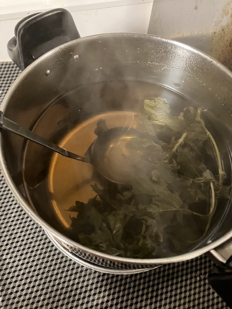 クエン酸と砂糖、みりんを混ぜて15分間煮詰めてシロップ化。赤シソとは違い、砂糖の色と合わさったべっ甲色に仕上がりました。