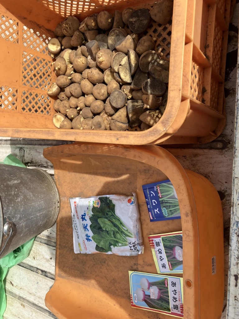 ほうれん草とかぶの種まき、ジャガイモの植え付けを行いました。