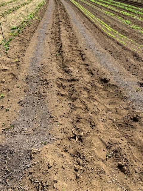 ニンニクの畑に生えていた雑草を刈り、写真の畑は空心菜・ひゆ菜を植える予定の場所に肥料まきを行いました。