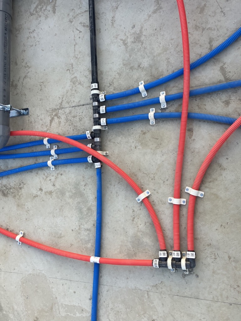 排水パイプと給水のホース、キッチンのガス管が設置。キッチンや風呂まわり、トイレの水回りがみえてきました。昨日まで工事は4連休状態だったので、少し進捗に不安がありました。