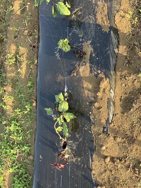 なぜ、ナスの間に植えたかというと、シソの香りがナスの害虫を寄せ付けなかったり、ナスの生育にプラスとして働くためです。これを「コンパニオンプランツ」と呼びますが、混植なので農協に提出する作物管理記録簿の扱いが面倒くさくなるため、あらかじめ農薬を使わない予定の野菜に限り行っております。