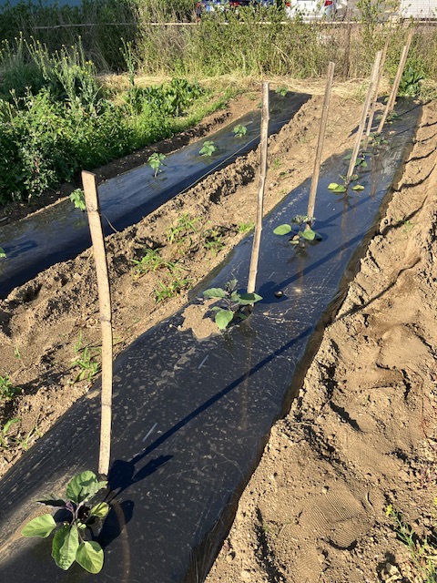 今日は出荷作業の合間にカラス対策でナスの上にテグス張り。