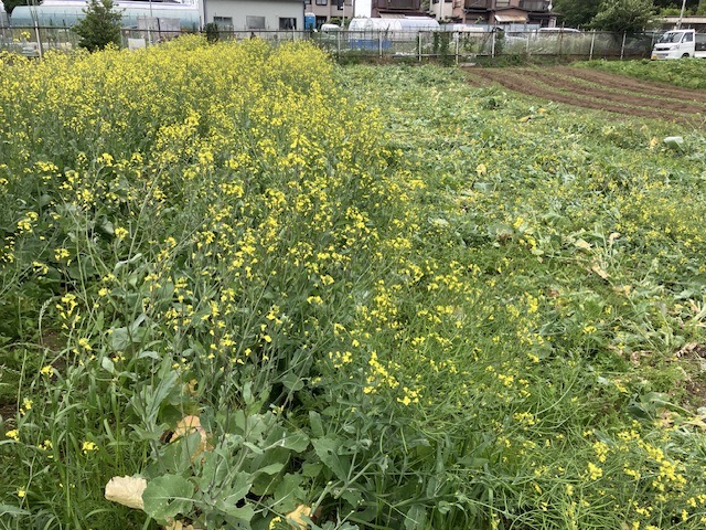 今日はのらぼうなの撤去作業。草刈り機で折って、トラクターかけました。1メートル以上伸びてたので大変……