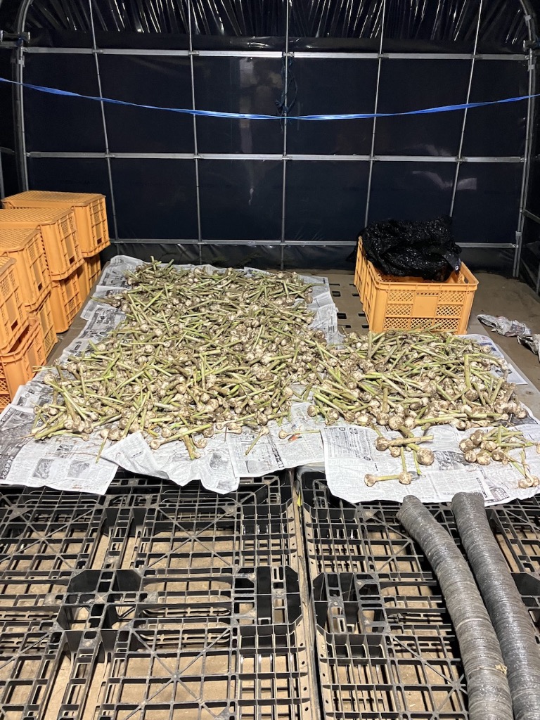 密植をするため、去年より畝数を大幅に減らしたので(9分の1)、収量は大きく落ちた……と思いきや、去年の半分ぐらいと、なかなかコスパの良い収穫でした。3月が寒かったので玉は小さめですが……