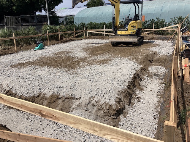 ユンボで基礎を入れる部分を掘り、砕石を入れてから1回目のコンクリートを入れました。明日は基礎本体の仕切を入れたりするそうです。