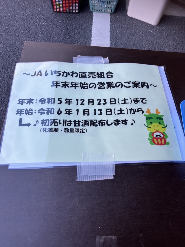 写真のシェンロンさんとダルマさんが言うとおり、夕市は2週間お休みとなります。年明け13日は甘酒のプレゼントもありますので、ぜひお越しください😋