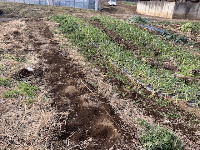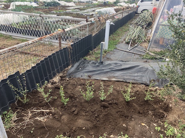 現在、3区画空いております。すぐに使用できるのは何もない1区画、5月から使用できるのは写真のニンニクが植えてある2区画となります。