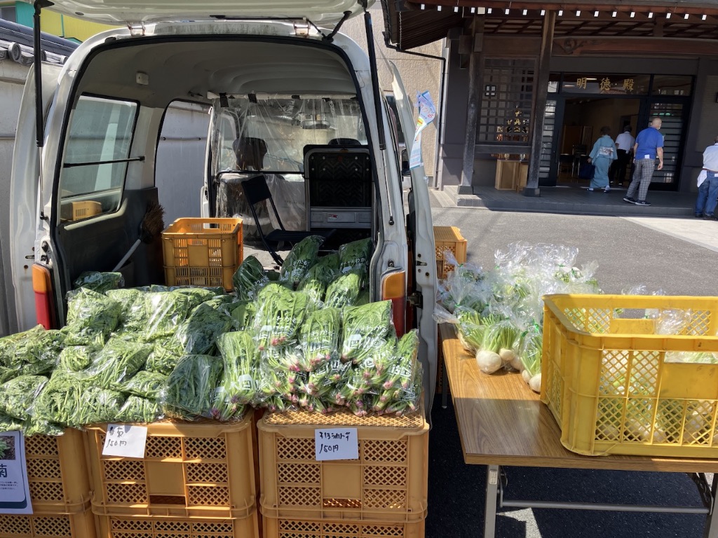 荷台に野菜を並べ、代車の横にレジを置くスタイルで販売しました。