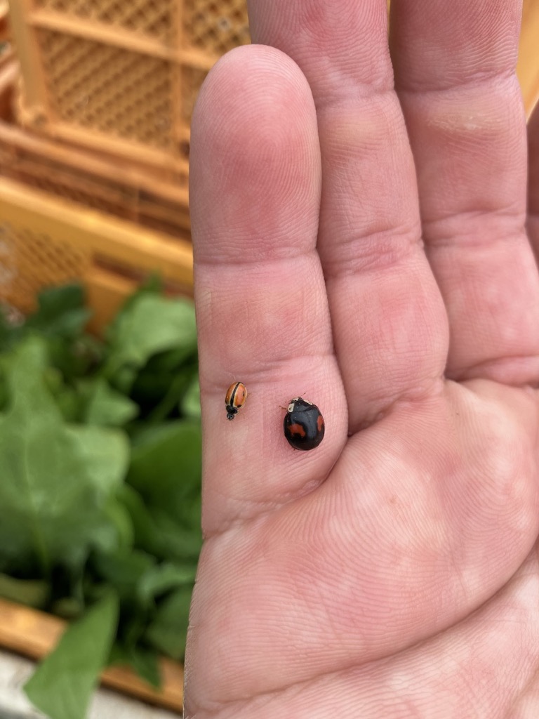小さい方はヒメカメノコテントウ。こちらもアブラムシを捕食します。写真にはいませんが、このテントウムシと柄違いですが、ほぼ同じサイズ(5ミリほど)で模様がなく無地黄色のテントウムシはキイロテントウ。こちらは菌食タイプでうどんこ病を食べます。
