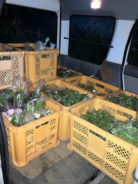 写真の積載は、明日の鯉のぼり祭りと夕市のダブル出荷です。奥の2段は夕市、平積みは鯉のぼり祭りの野菜です。