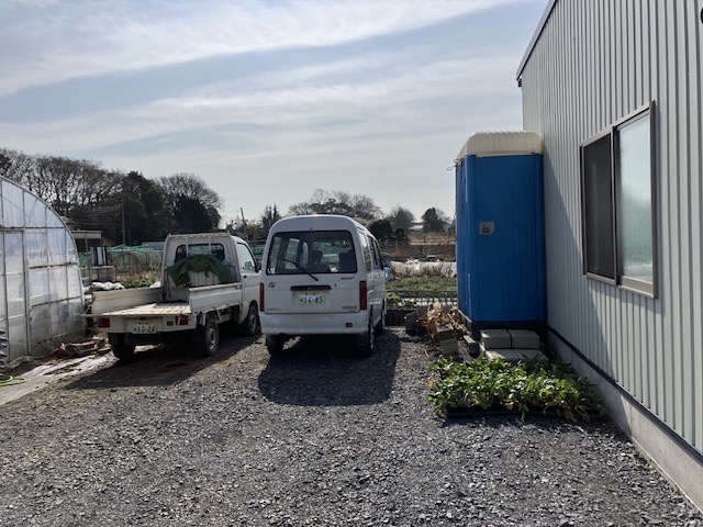 今日は倉庫を建設した鉄鋼屋さんが最後の仕上げとして、トイレとコンテナ倉庫をユニックで移動してくれました。