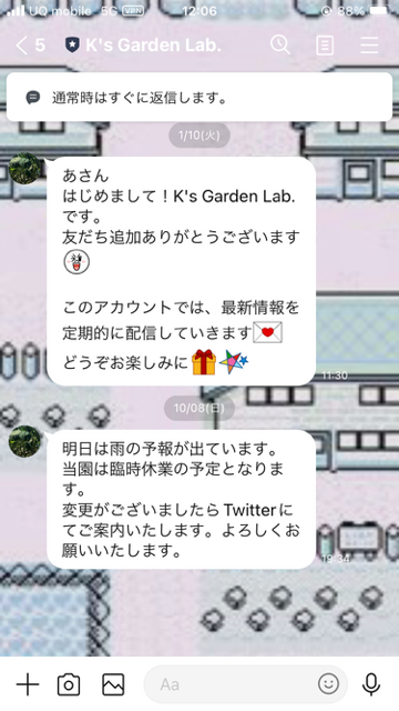 当園の公式ラインがございます。収穫される野菜のラインナップとか、予告をご案内したり、臨時休業のご案内したりします。